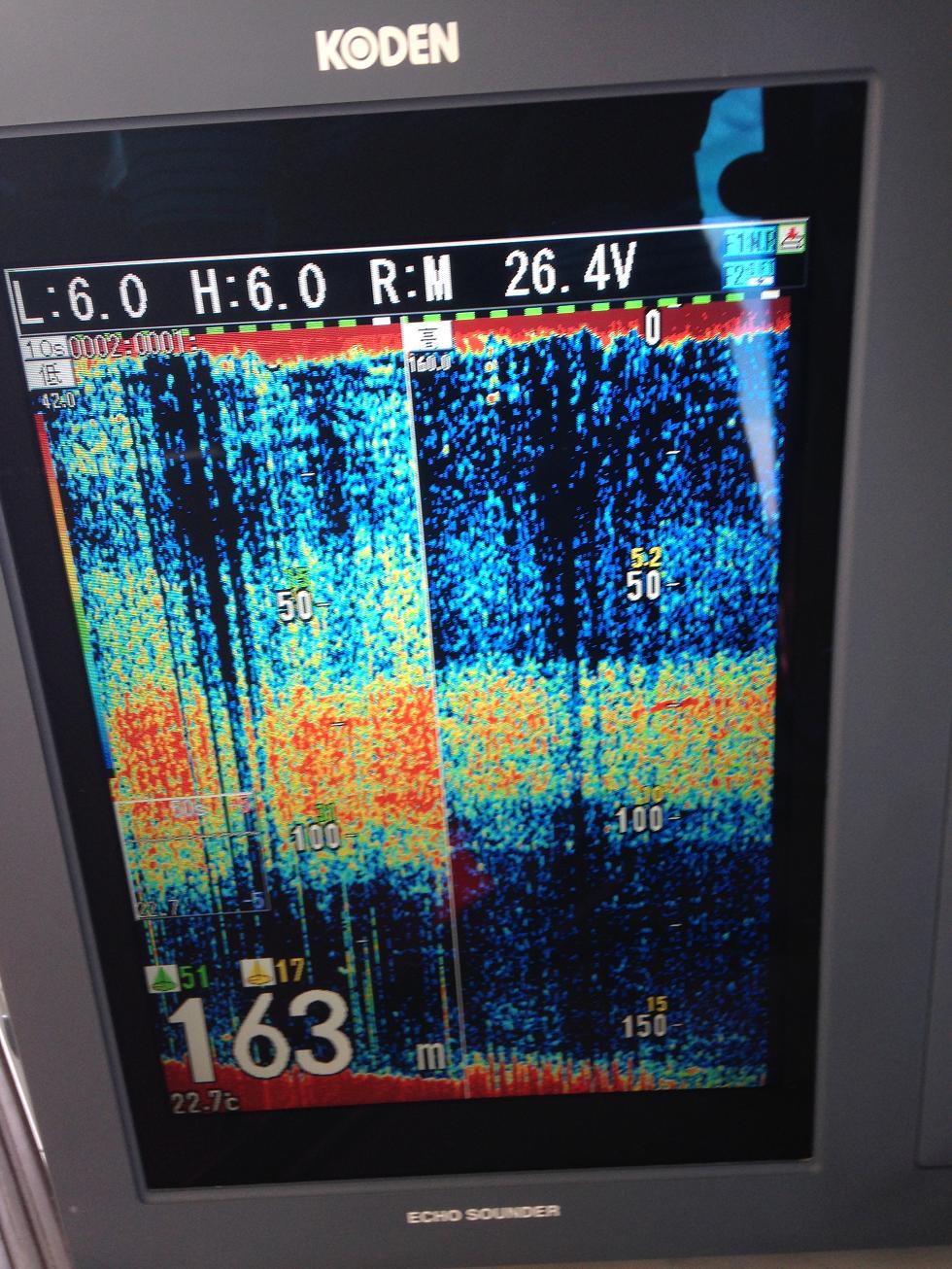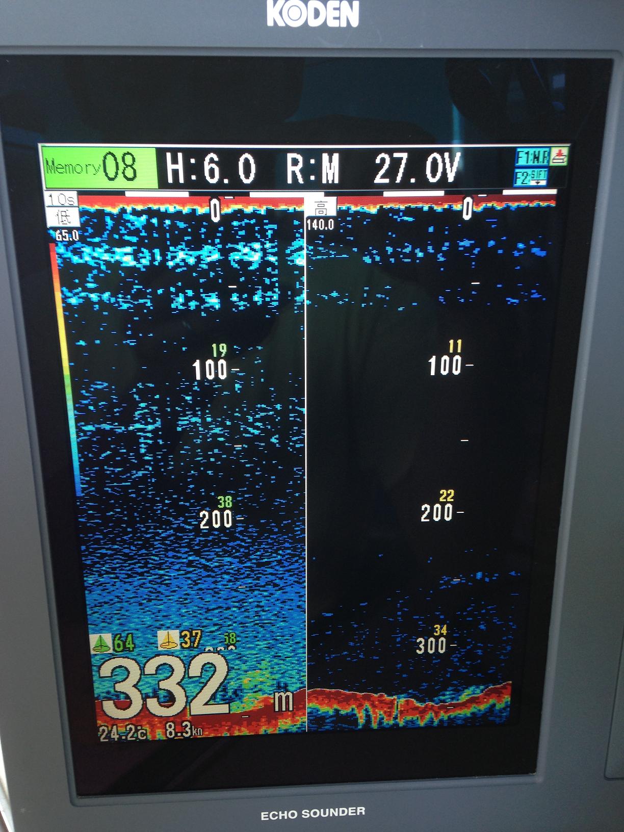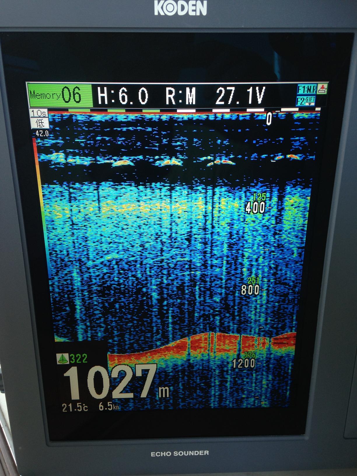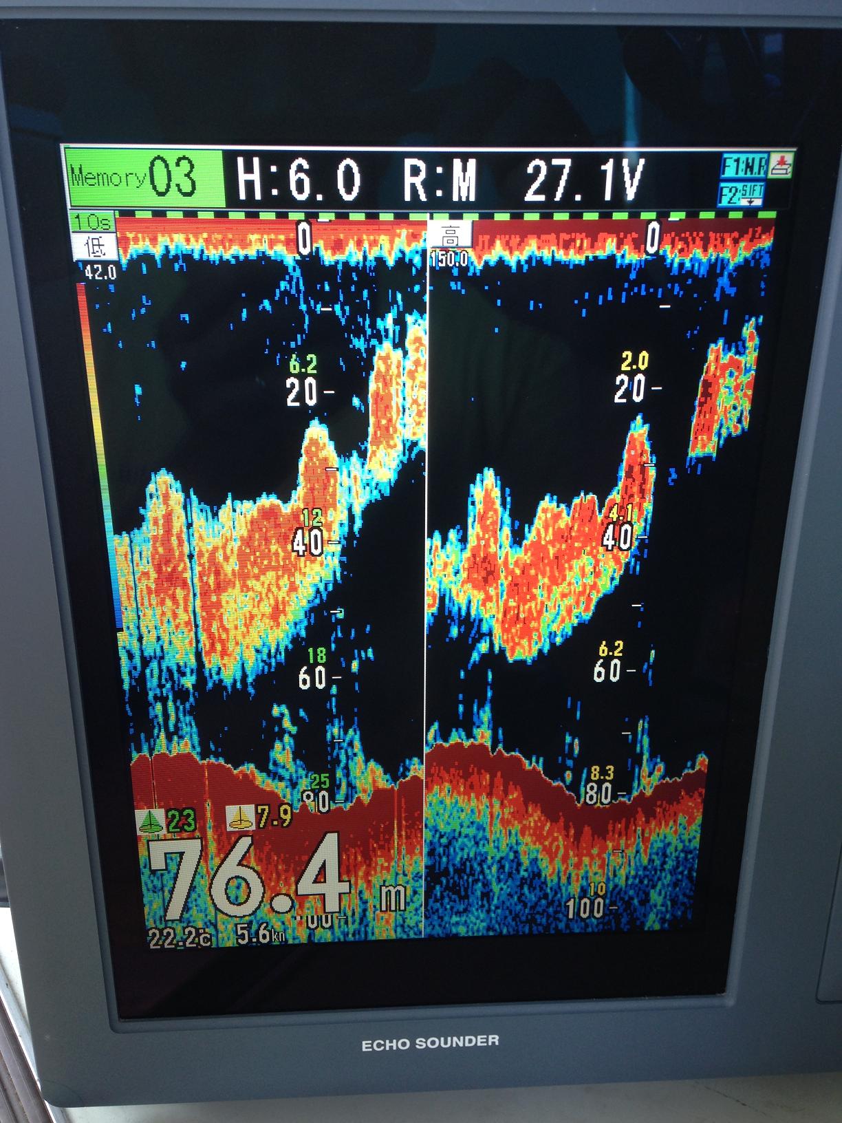 船団到着後、魚探(CVS-1410B)でイカを探す。